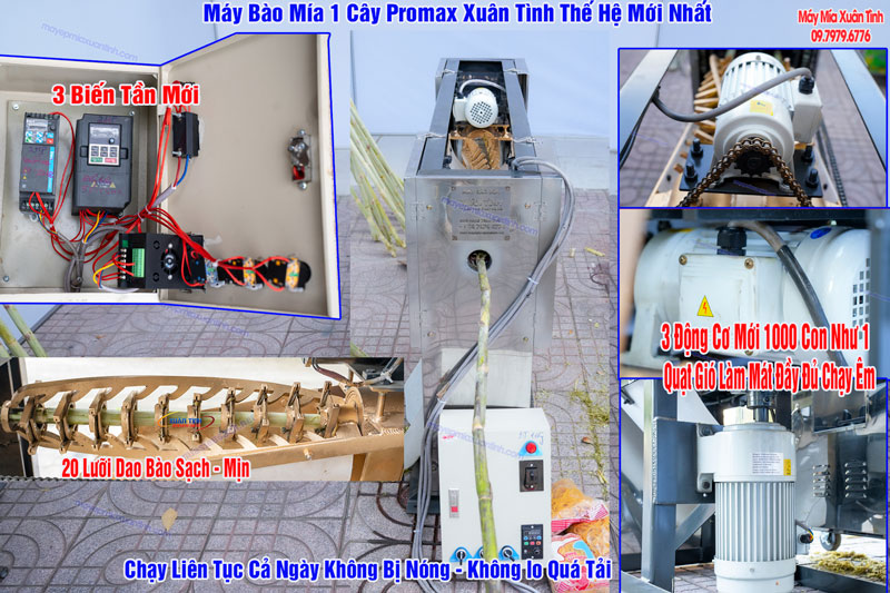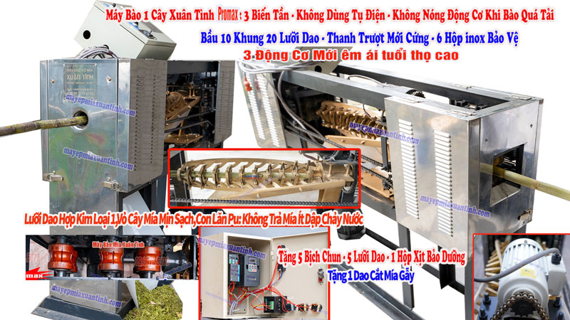90% sản phẩm từ Xưởng Máy Mía Xuân Tình sử dụng 3 Biến tần kiểm soát được tốc độ cạo, bảo vệ tuổi thọ động cơ, sử dụng khung xương Sắt V63 chống rung, luôn có quà tặng 5 bịch dây chun,5 lưỡi dao inox sơ cua đi kèm Dòng thế hệ mới bầu 10 khung 20 lưỡi dao và 6 hộp inox bảo vệ. Thế hệ nâng cấp mới nhất 3 động cơ mới 1000 con như 1 quạt gió làm mát đầy đủ chạy êm ái độ bền rất cao lâu dài bảo hành sửa chữa rất dễ vì tính đồng nhất khác biệt hàng động cơ cũ!.