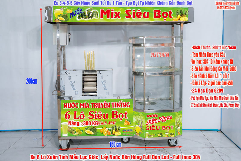 - Xe nước mía 6 lô lục giác là loại máy mía đắt tiền tiên tiến nhất hiện nay áp dụng tất cả công nghệ mới nhất cho kỹ thuật và thiết kế mọi thông số kỹ thuật đều gấp 2-4 lần so với máy bình thường đưa đến 1 siêu phẩm khủng long tạo bọt với tuổi thọ máy 10 năm.