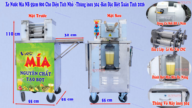 Ngoài diện tích nhỏ gọn thì xe nước mía 55cm ép khỏe như các dòng xe lớn và kèm theo bộ đánh bọt lợi lại.